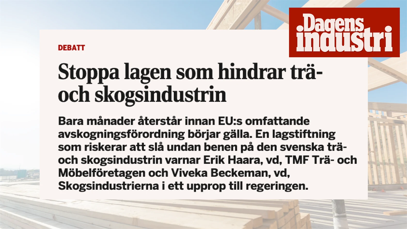Bara månader återstår innan EU:s omfattande avskogningsförordning börjar gälla. Lagen har stor inverkan på svenska företag som producerar, importerar eller handlar med trä, men även soja, gummi, oljepalm, kaffe, kakao, eller nötkreatur. Nu gör TMF och Skogsindustriernas vd:ar Erik Haara och Viveka Beckeman gemensam sak i ett upprop till regeringen som i dag publicerades i Dagens Industri.