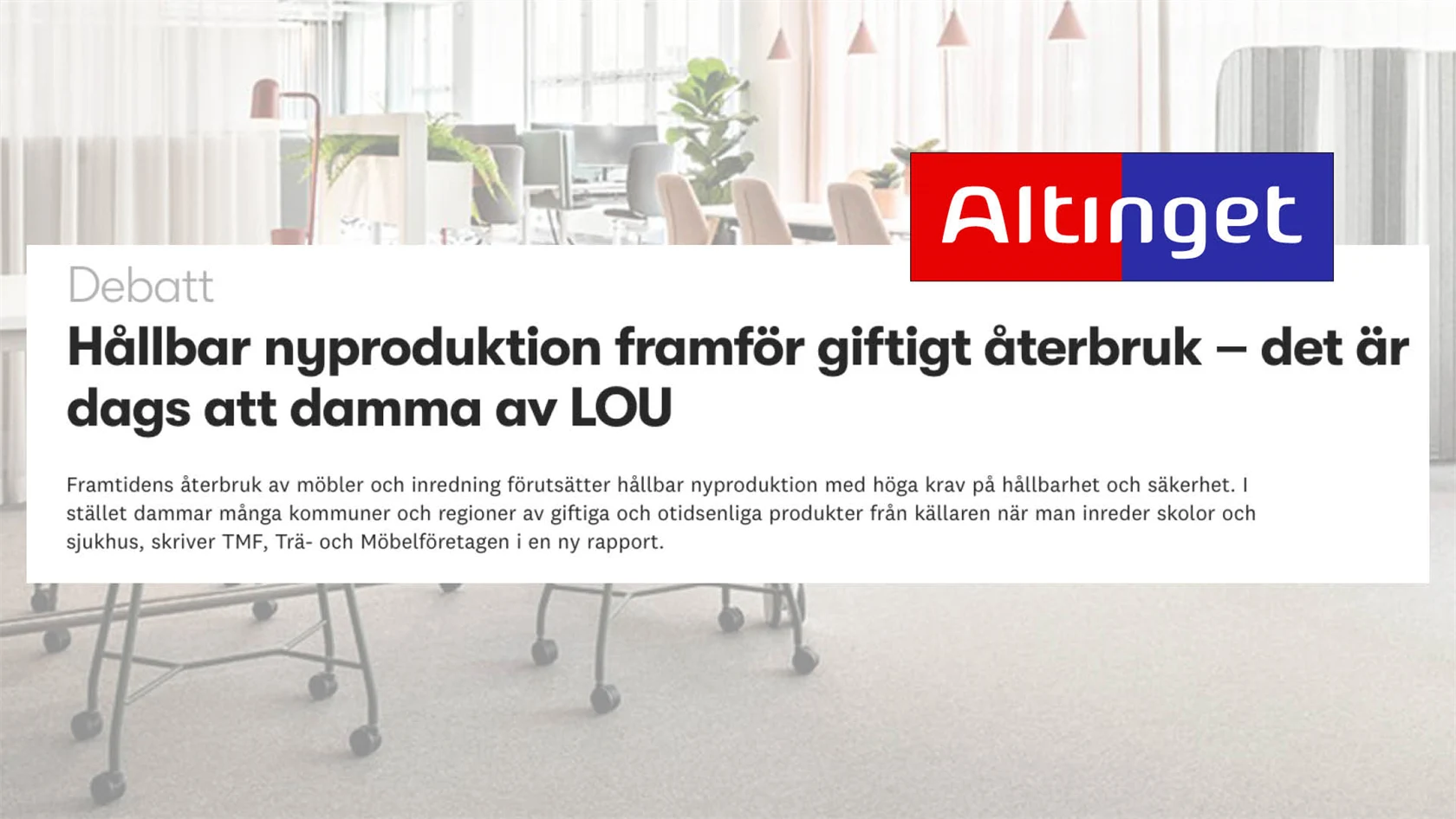 Framtidens återbruk av möbler och inredning förutsätter hållbar nyproduktion med höga krav på hållbarhet och säkerhet. I stället dammar många kommuner och regioner av giftiga och otidsenliga produkter från källaren när man inreder skolor och sjukhus, det skriver TMF:s vd Erik Haara och näringspolitiska expert Simon Imner i ett debattinlägg på Altinget.se.