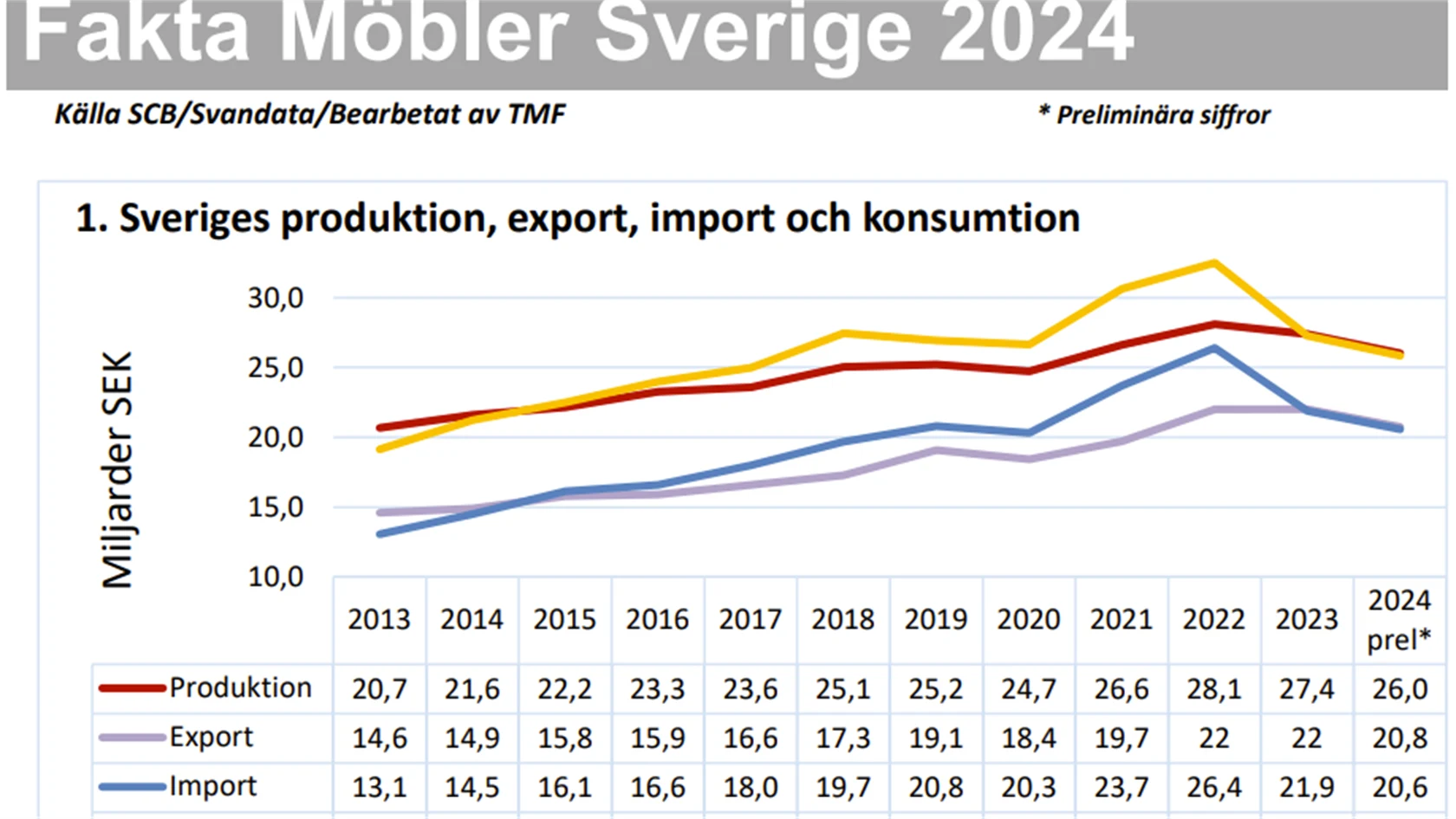 TMF:s årliga statistikrapport visar på en fortsatt nedgång för möbel- och inredningsbrancshen i produktion, export, import samt konsumtion. Det är andra året i rad som siffrorna pekar nedåt efter den kraftiga uppgången under pandemiåren.