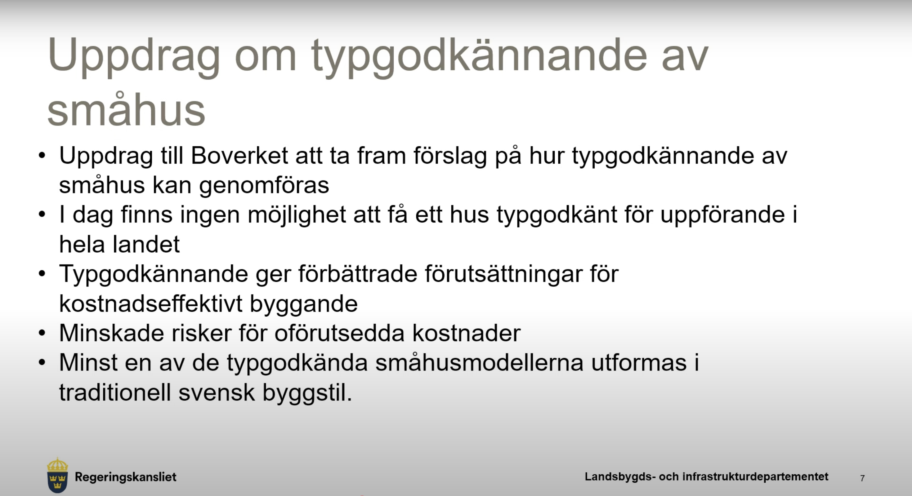 Förslaget om typgodkända småhus fanns med redan i höstbudgeten 2024, men nu får Boverket ett konkret uppdrag att utreda frågan fram till sommaren 2026. På måndagens presskonferens deltog bostadsminister Andreas Carlson (KD), finansmarknadsminister Niklas Wykman (M), Patrik Larsson (L) och Mikael Eskilandersson (SD). Uppdraget innebär att Boverket ska kartlägga nuvarande regelverk och föreslå modeller för typgodkända småhus som inte kräver bygglov.
